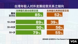 除了国族认同之外,是不是年龄层也有差异?在台湾经常听到民众谈论所谓的“世代战争”,在台湾,是不是年龄因素也反映在对美国和对中国的观感上呢?谭妲分析指出:“我们看到较年轻的台湾民众倾向对美国抱持好感,比五十岁以上的年龄层明显更支持美国,他们也更支持美台强化政治与经贸关系,举例来说,大约八成台湾年轻人支持强化美台经贸关系,但是问到是否支持强化两岸经贸关系,很明显变化就出现了。台湾年轻人当中只有大约四成支持强化两岸经贸关系,这明显与五十岁以上的族群观念不同,年轻偏大的台湾人约有55%支持加强两岸经贸往来,因此这当中的确是存在着“世代差距”。 ”